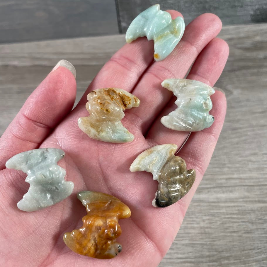 These carved bat gemstone figurines bring a touch of mystery and magic to any crystal collection. Each miniature bat is crafted from natural gemstone, showcasing unique color patterns and energy vibrations that make every piece one of a kind. Ideal for crystal retailers, metaphysical stores, gift boutiques, and spiritual resellers, these small gemstone bats symbolize intuition, transformation, and protection.