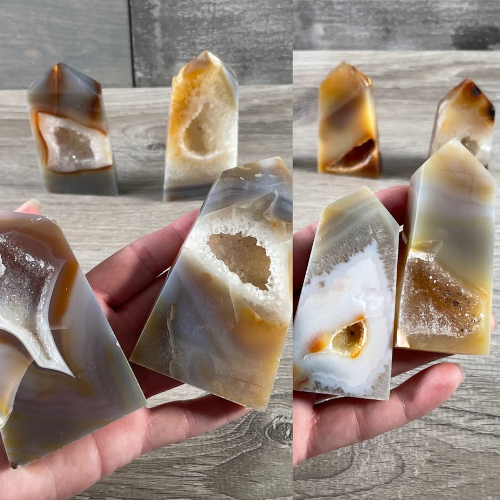 These Druzy Agate Flat Obelisks are a striking fusion of natural beauty and metaphysical energy. Featuring a polished flat surface with sparkling druzy inclusions, each piece showcases the unique banding and crystalline formations that agate is known for. Ideal for wholesale buyers, this obelisk serves as a decorative accent, energy healing tool, or addition to crystal grids. Available in bulk for retailers, crystal shops, and spiritual businesses, these obelisks are a must-have for collectors and enthusiasts.