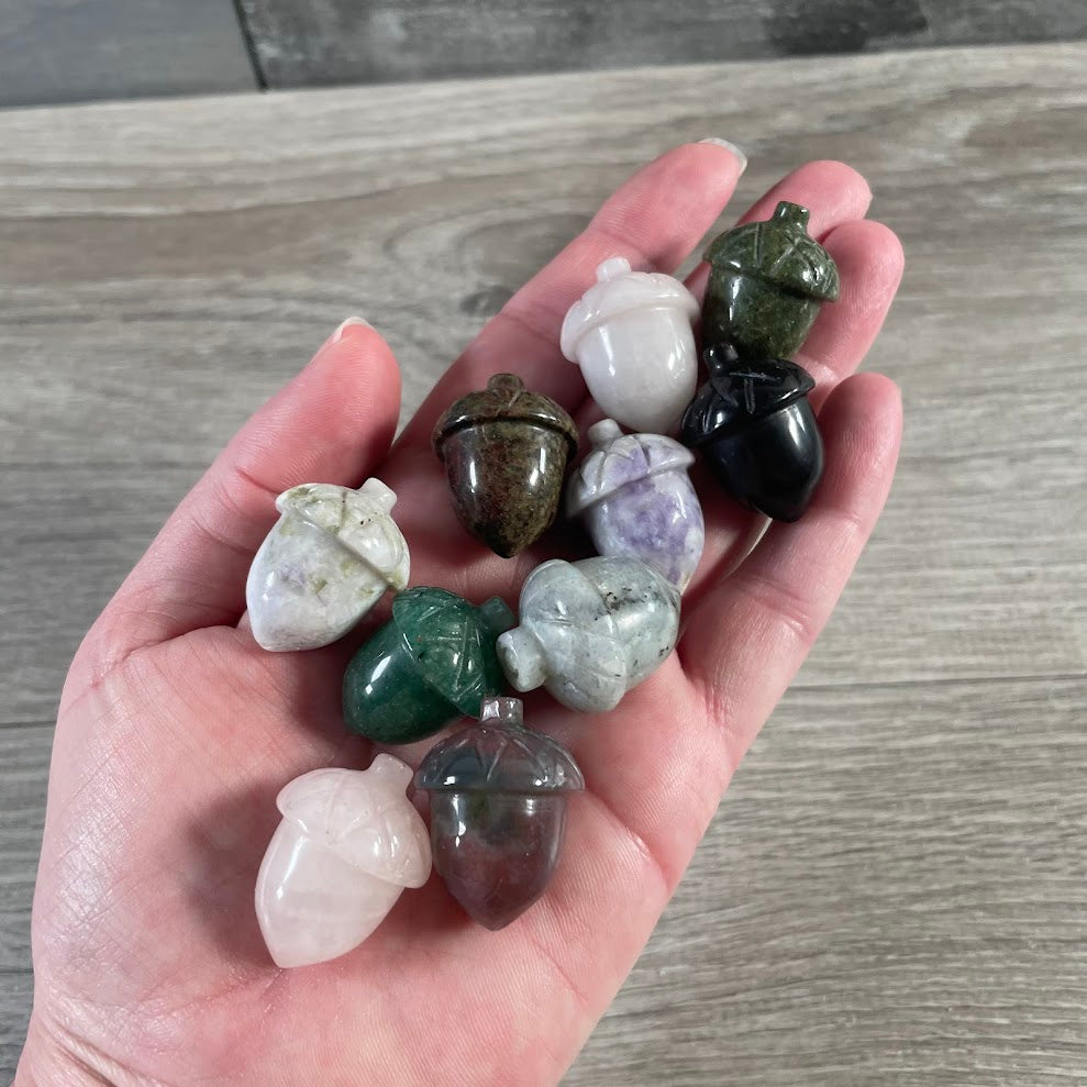 These small gemstone acorn figurines are crafted from gemstones and crystals, making them ideal for seasonal displays, crystal collections, or nature-inspired décor. Each acorn showcases the unique patterns and colors of the stone it's carved from, offering a charming touch for spring and autumn tablespaces, altars, or gifting. Sized perfectly for pocket totems or bowl fillers, these acorns blend whimsy with earthy energy—popular with collectors and resellers alike.