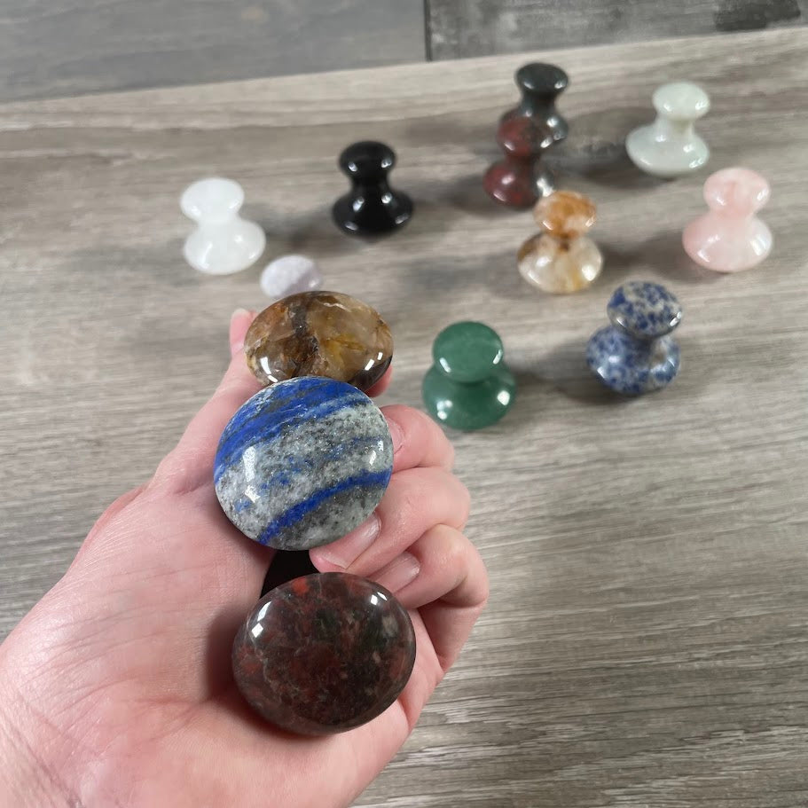 Stock your shelves with premium wholesale gemstone facial rollers, perfect for skincare routines and wellness boutiques. These double-ended massagers feature genuine crystals such as rose quartz, hematite, or jasper, designed to help with lymphatic drainage, facial tension, and skin revitalization. Ideal for estheticians, spas, or retail resale, our gemstone rollers are both functional and luxurious, making them a must-have item for beauty and self-care enthusiasts.
